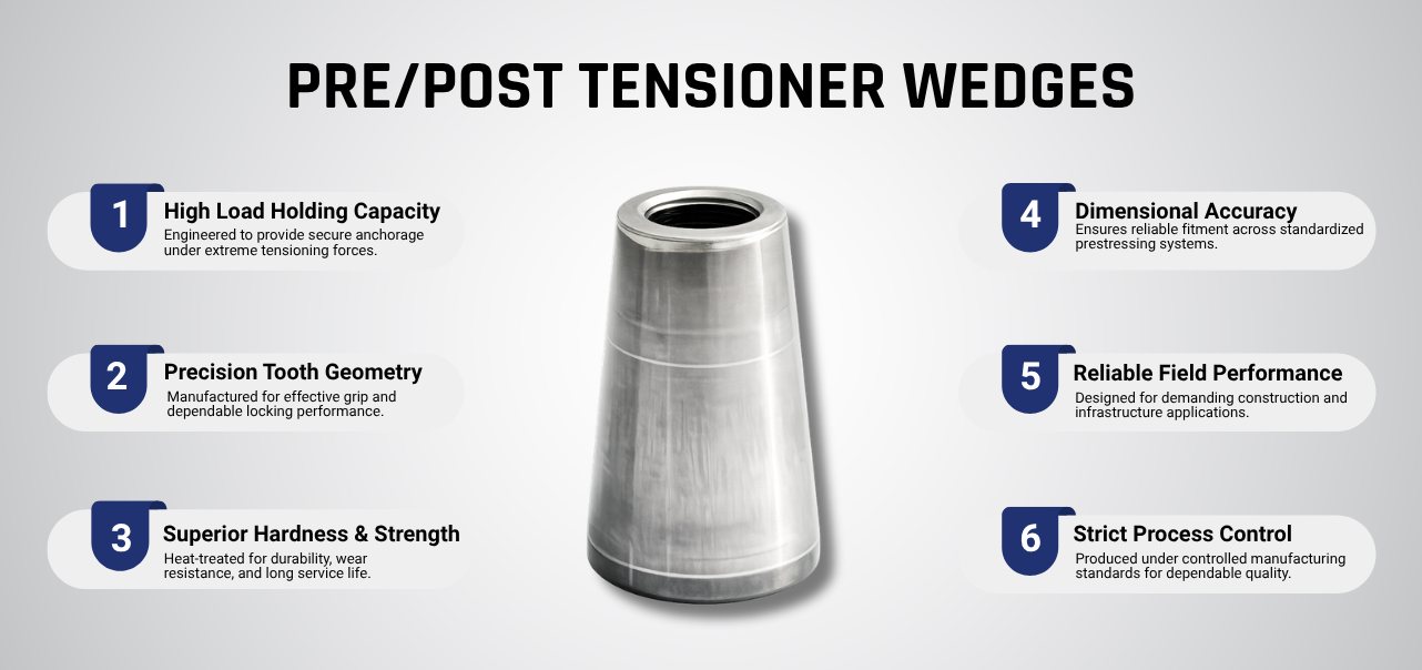 High-strength pre and post tensioner wedges ensuring firm grip and reliable performance under heavy loads.